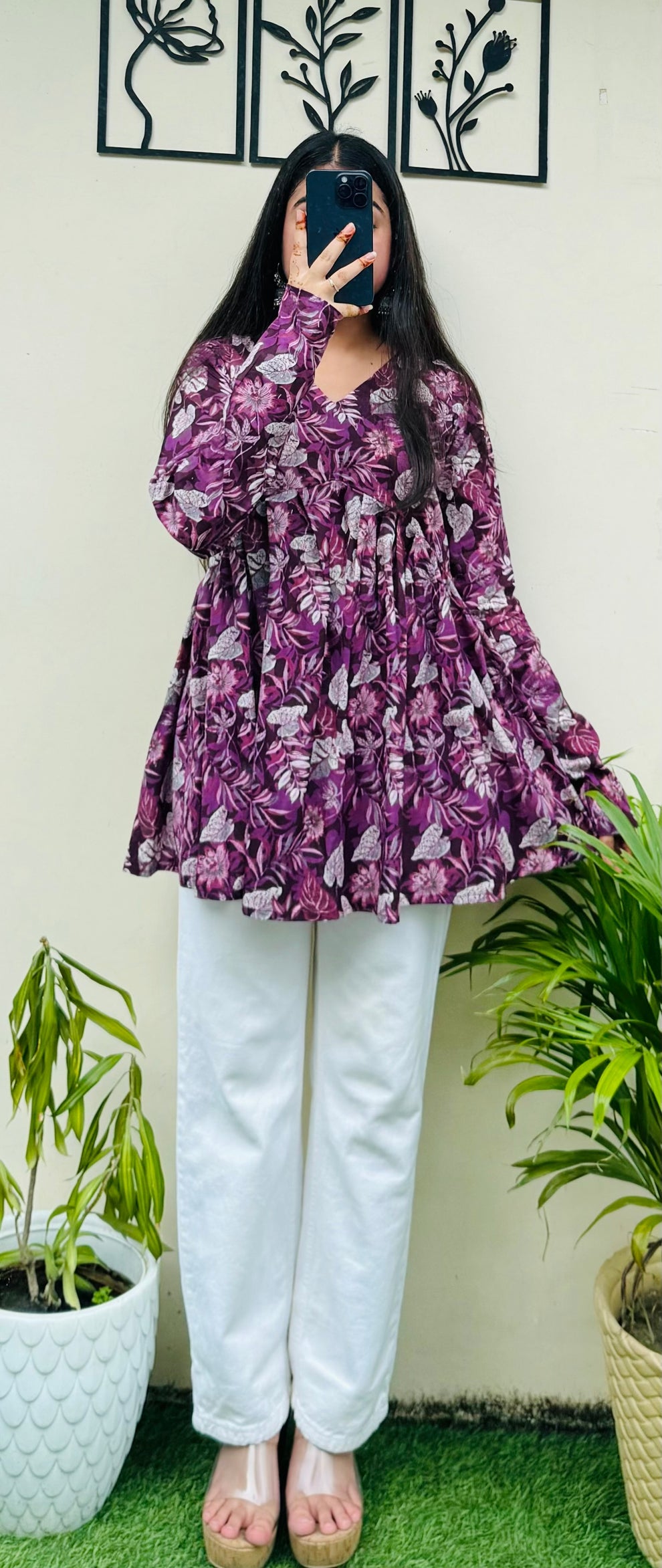 A cotton peplum top is a stylish and feminine top featuring a fitted bodice that flares out at the waist, creating a flattering silhouette. Made from soft, breathable cotton, it offers all-day comfort and is perfect for both casual and dressy occasions. Pair it with jeans, skirts, or tailored pants for an effortlessly chic look.